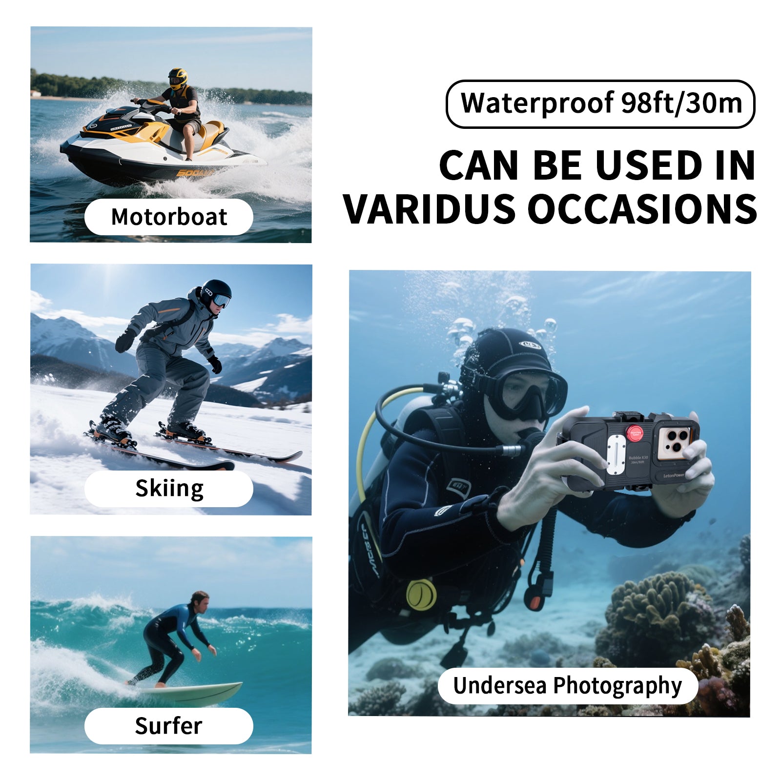 • [New Upgraded Diving Case] The upgraded diving phone case greatly improves the performanceof waterproof and pressure resistance,and the buttons operation is more sensitive. Unlike otherBluetooth products,the alloy buttons of this underwater phone case can be operated simply.Youcan easily switch between photo and video,switch between the front and rear camera