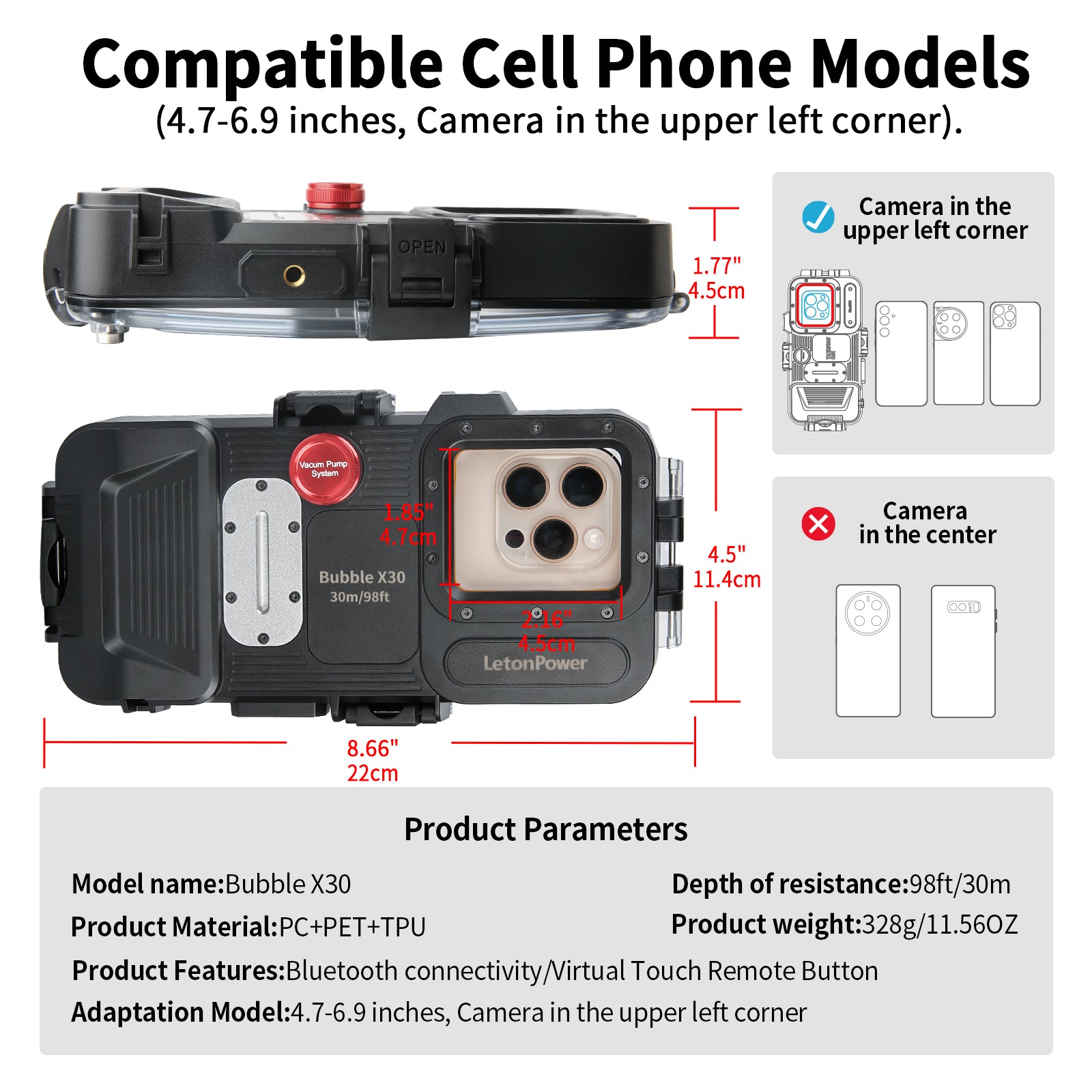 • Wide compatibility: Upgrated diving case is compatible with 4.7-6.9 inches smartphones,compatible with iPhone 15 Pro Max/ 15 Plus/ 15 Pro/ 15/ 14 Pro Max/ 14 Pro/ 14 Plus/ 14/ 13 ProMax/ 13 Pro/ 13/ 13 mini/ 12 Pro Max/ 12 Pro/ 12/ 12 Mini/ 11 Pro max/ 11 Pro/ 11 for Samsung523 Ultra/ 523 Plus/523/522 Ultra/522 Plus/522/521 Ultra/ 521 Plus/ 521/ 521 FE/ 520 ultra/520 Plus/ 520 LG Huawei Xiaomi Google, etc.
