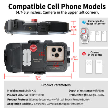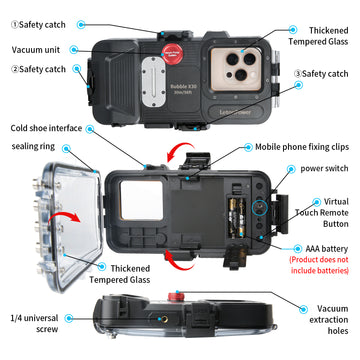 • [New Upgraded Diving Case] The upgraded diving phone case greatly improves the performanceof waterproof and pressure resistance,and the buttons operation is more sensitive. Unlike otherBluetooth products,the alloy buttons of this underwater phone case can be operated simply.Youcan easily switch between photo and video,switch between the front and rear camera