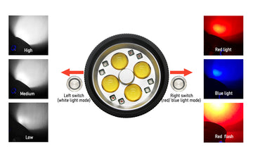- In any mode, long press the switch for two seconds to turn off the flashlight.